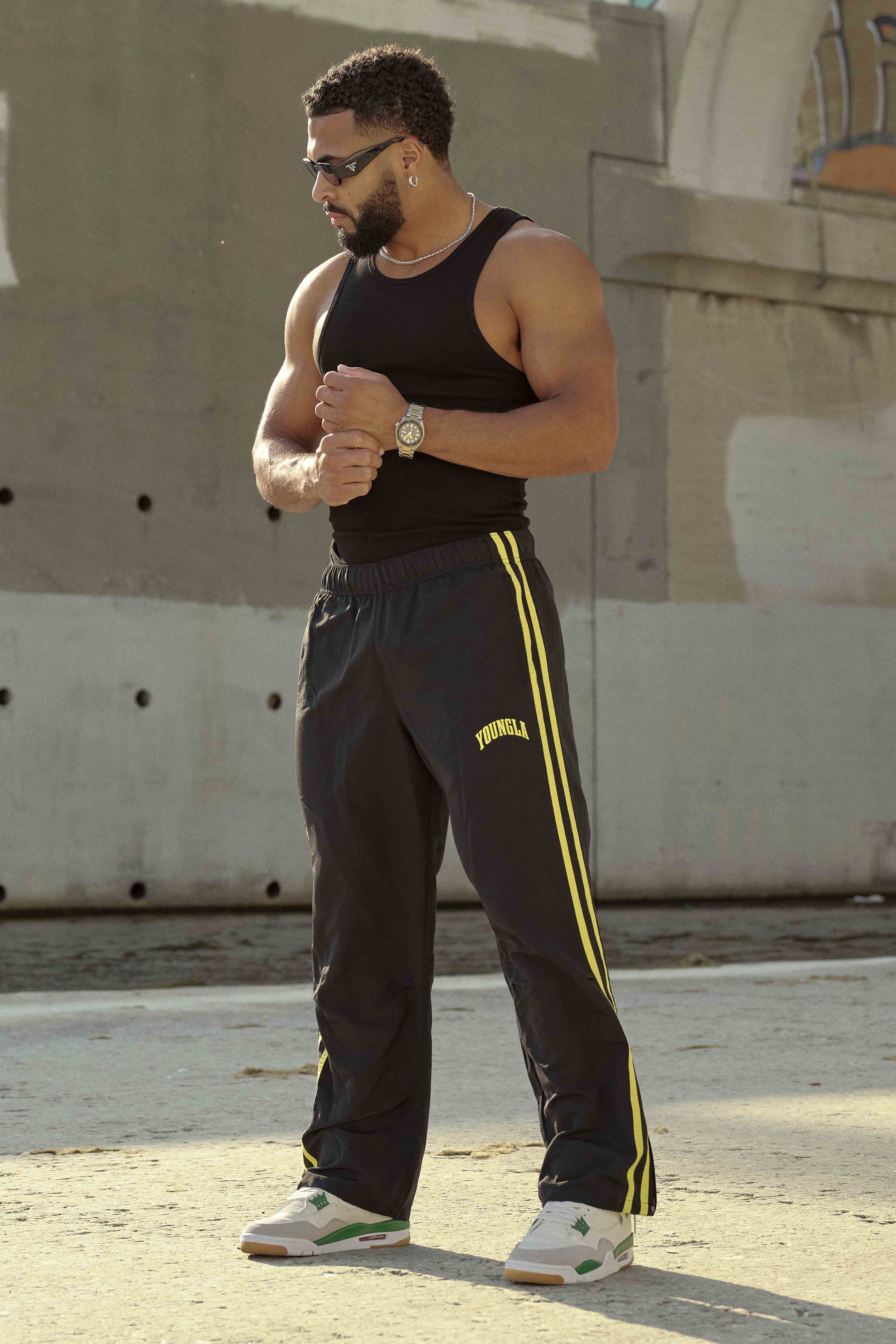 DESIGN: The flagship pants perfectly capture the essence of old-school style with their loose-fitting design and vintage aesthetics. These joggers, made of polyamide, offer durability. With no cuffs and two side strips in contrasting colors, they add a touch of uniqueness and style to your ensemble. Elevate your casual look to new heights.