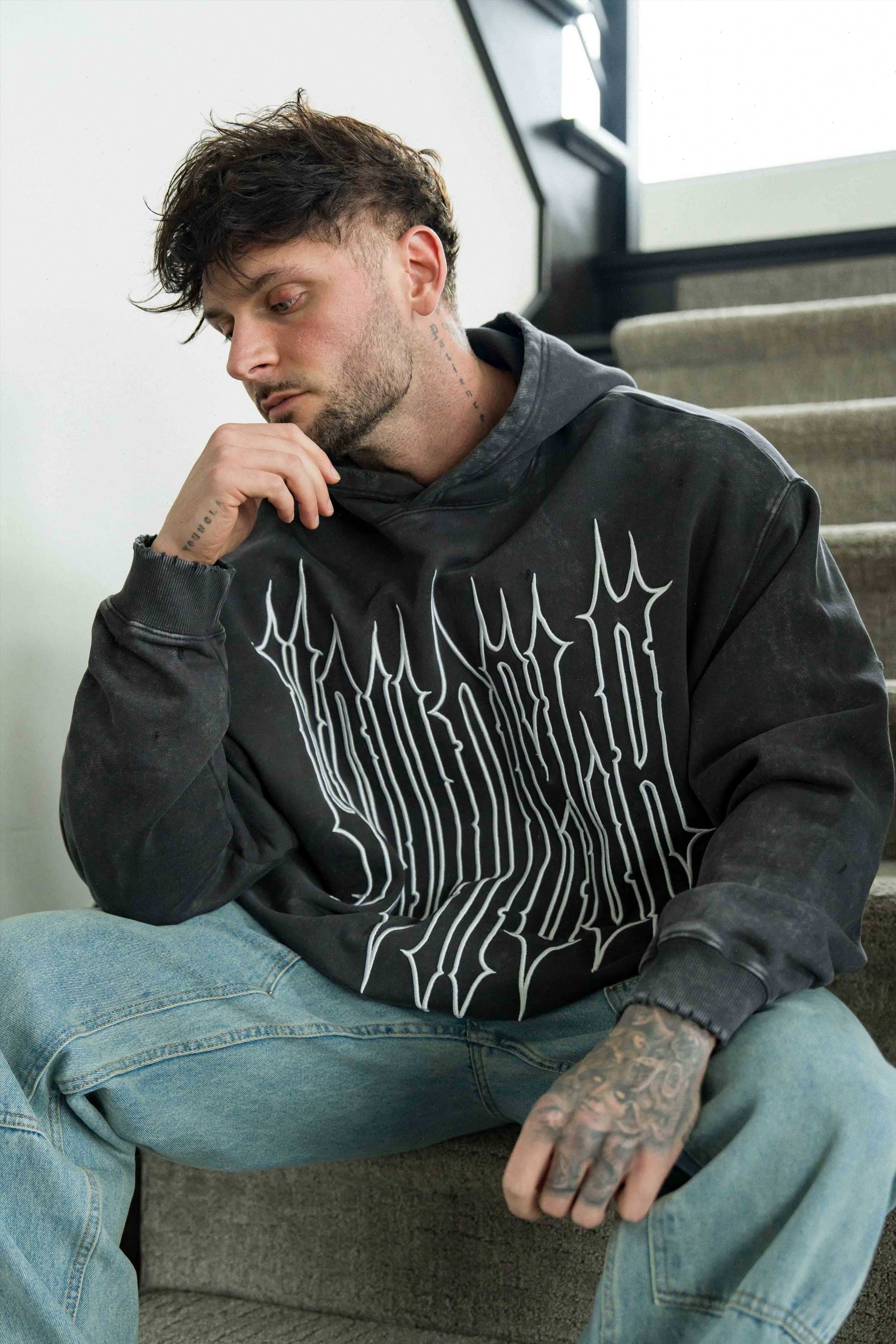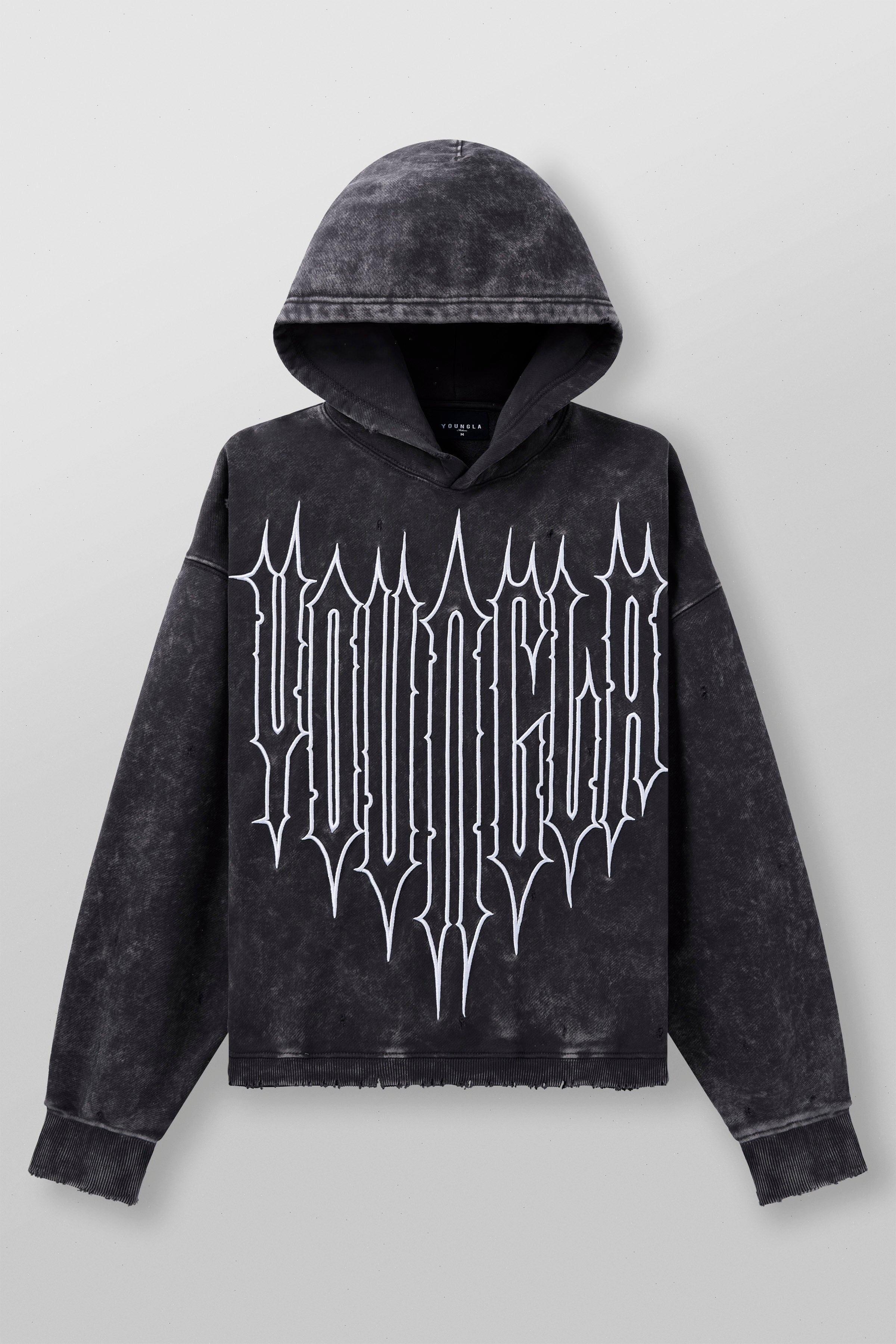 DESIGN: The Revenge Pullover Hoodie. Made from premium acid-washed cotton, this hoodie features an embroidered outline of the Revenge logo on the front, adding a striking detail to the classic pullover. Distressed cuts on the cuffs and waistband, paired with a short waistband height, give it a rugged, modern look.