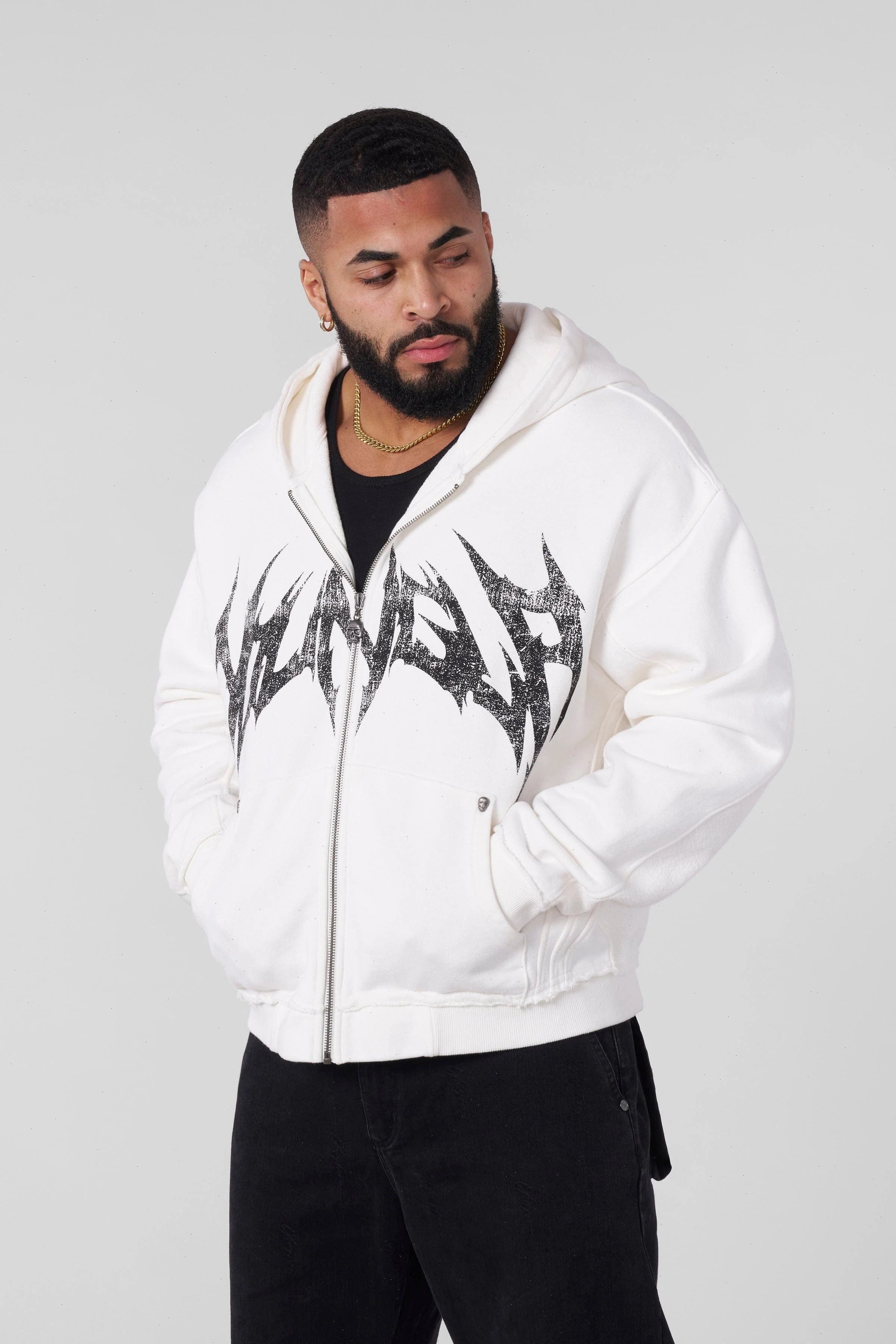DESIGN: The Villain Hoodie is a statement piece with an edge. This zip-up hoodie features a distressed logo across the chest, skull-studded pocket corners and zipper puller, and exposed raw seams on the waistband and cuffs for a rebellious, worn-in look.