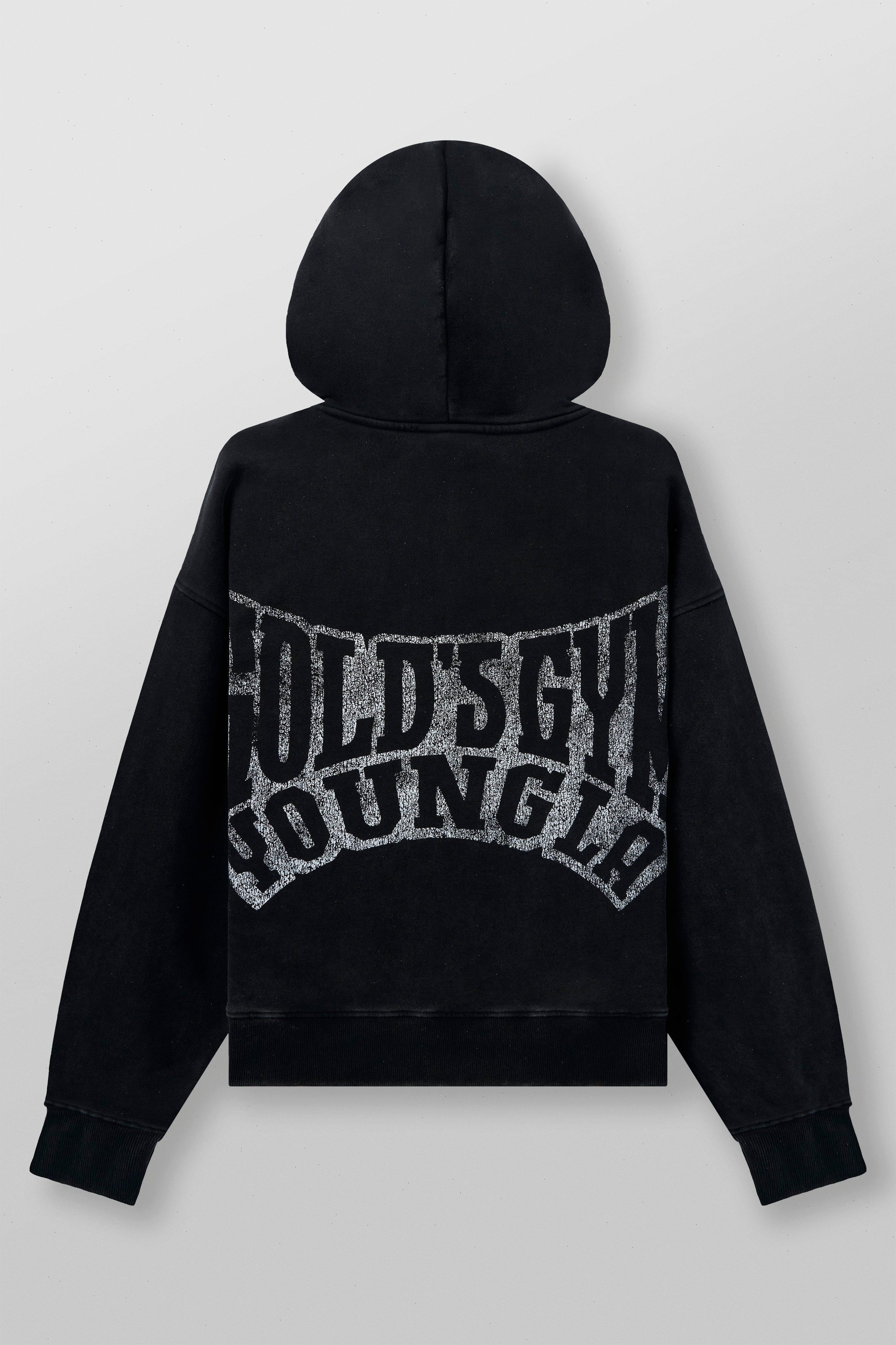 DESIGN: This zip-up hoodie from the Gold’s Gym x YoungLA collaboration combines classic gym style with modern streetwear. Featuring an oversized fit and a washed fabric for a vintage vibe, it’s designed for maximum comfort and a laid-back look. The back showcases a bold, distressed Gold's Gym x YLA graphic, adding a statement piece to your wardrobe.