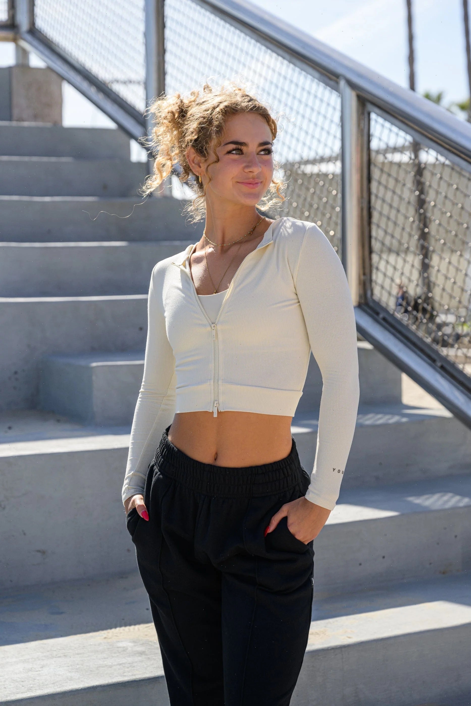 DESIGN: This Dual zipper jacket is the perfect transitional piece for this weather. This jacket has two zippers to give you variety in your style choices. The Dual zipper Jacket is made of a soft ribbed fabric that hugs the body just right. It is a comfortable material that pairs perfectly with your gym outfit.